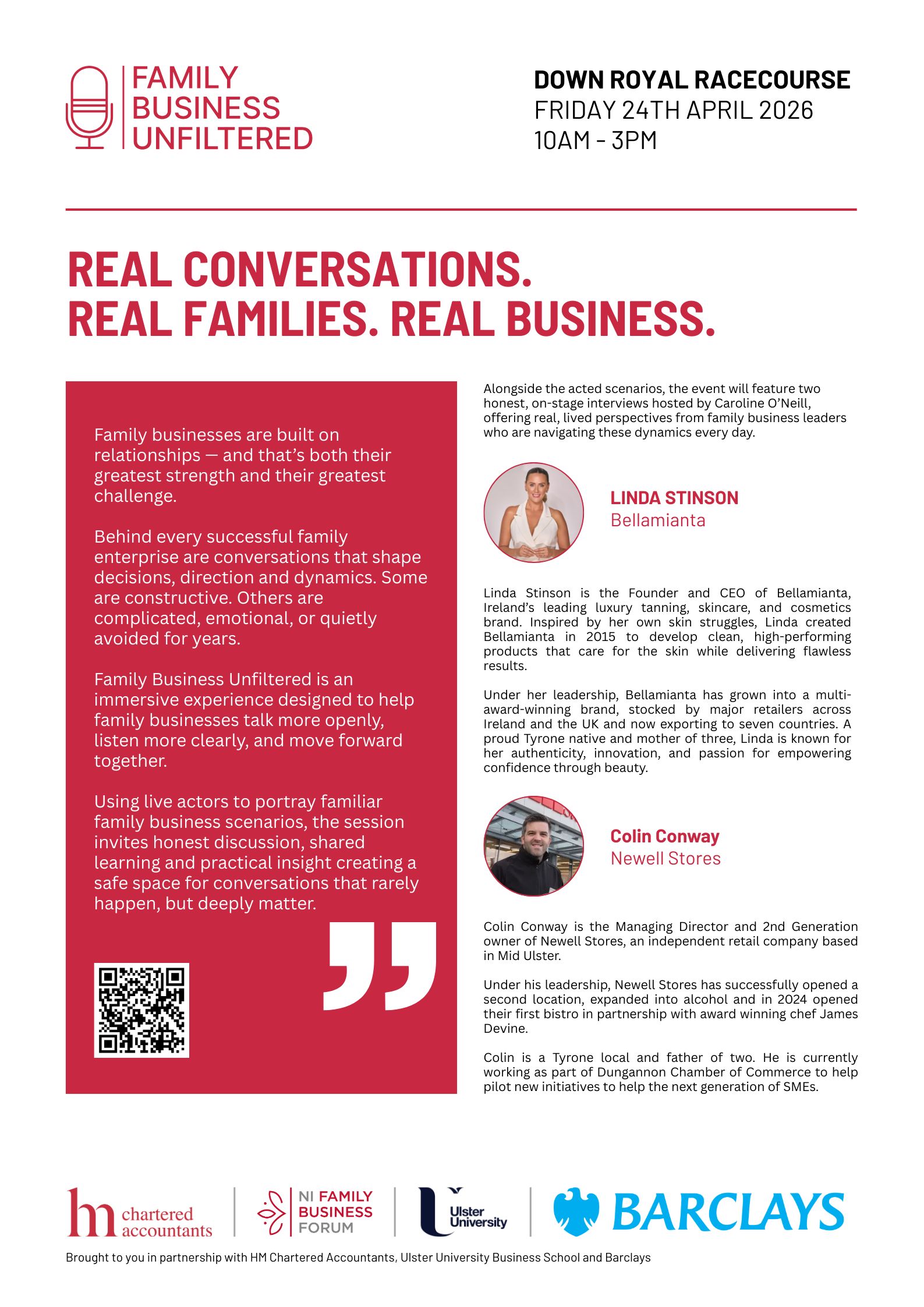 Family Business Unfiltered is a unique event designed to open up honest conversations about the realities of running a business with family. The event is brought to you in partnership with HM Chartered Accountants, Ulster University Business School and Barclays, bringing together expertise from across the family business community.